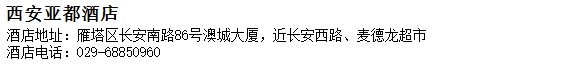 酒店地址:西安 雁塔區 長安南路86號澳城大廈,近長安西路、麥德龍超市