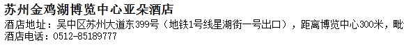 酒店地址:蘇州 吳中區 蘇州大道東399號(地鐵1號線星湖街一號出口),距離博覽中心300米,毗鄰國際金融中心