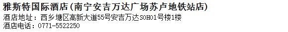 酒店地址:南寧 西鄉塘區 高新大道55號安吉萬達SOHO1號樓1樓