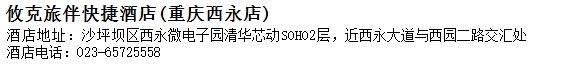 酒店地址:重慶 沙坪壩區 西永微電子園清華芯動SOHO2層,近西永大道與西園二路交匯處