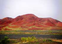 奇臺火燒山與吐魯番的火焰山不同,火焰山因溫度高而聞名天下,而奇臺火燒山是因為其山體顏色而聞名,奇臺縣境內的五彩灣也是因為山體的顏色而有名的。火燒山與五彩城的不同點在于,這里連綿起伏的山丘不是五彩斑斕,而全是由燒結巖構成的一片赭紅色。放眼環顧,幾乎見不到其它色彩。每逢晨昏,在朝陽或晚霞映照下,仿佛仍在熊熊燃燒,壯麗罕見,是216國道的一個耀眼景點。