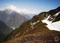 位于雅魯藏布江大拐彎的外側,海拔7294米,走向為東西弧形排列。多陡壁懸崖,山谷里發育著數十條冰川。其頂部較平坦,常年被冰雪覆蓋。早在三千萬年前,喜馬拉雅山的造山運動在這里崛起,于是便有了神韻光彩的加拉白壘峰。