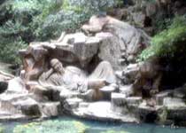 虎跑茶室邊上是濟祖塔院,是宋代濟顛和尚葬骨灰之處,院后壁上有數幅壁雕石刻,都是濟顛傳說。茶室前沿級而下,可至弘一法師紀念館。弘一法師(1880--1942年)姓李名息,號叔同,浙江平湖人,早年留學日本,精通音樂、戲劇,對書畫篆刻頗有造詣,曾在東南亞講佛學,1918年在虎跑出家,是一位學者和高僧。