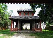 第一進為門樓。門樓正中是大圓拱門,兩旁是耳門。正門上方嵌著“海天勝境”四字。耳門上還分別雕有“漱月”“澈云”字樣。門樓正中處一塊約90公分、寬約50公分的石碑上刻著清代陶冶一筆寫成的“鵝”字。