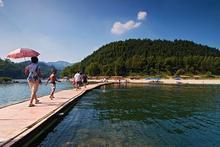 泛舟湖上,兩岸奇峰羅列,青山倒影,鳥語花香,人在畫中游。峰回水轉,可觀賞到那神態端莊,栩栩如生的古代婦女形象的石人山,以及“白馬飲泉”、“金雞啼岸”、“石鼓浮星”等勝景,增加無窮的情趣。