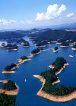 在黃山尖登臨山巔,向西北俯瞰,九十多個島嶼盡收眼底,如一串串珍珠撒落在湖面;