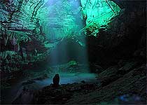 內洞 從外洞進入內洞須經此小穴逆水而行,洞穴寬3米余,僅容兩只小船并行進出,水面離穴頂30余厘米,欲進入內洞,必須平臥船中,仰面擦崖而過,饒有異趣,古人有“千尺橫梁壓水低,輕舟仰臥入口溪”之句。
