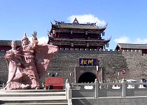 松州古城入口的標志性建筑物——文成公主和松贊干布成親塑像,向人們述說著千年前在此發生的促使文成公主入蕃和親的“唐蕃之戰”:吐蕃首領松贊干布派使者前往長安求婚。路過松州,被州官徐齊扣押,松贊干布大怒,親率大兵二十萬入侵松州,都督韓威應戰失敗,太宗命吏部尚書侯君集統軍抵達松州,川主寺一戰,松贊干布兵敗回藏。干布回藏后又遣使臣送黃金以求通婚和好,太宗曉以大義,遂將太宗女文成公主嫁于松贊干布,傳為千古佳話。