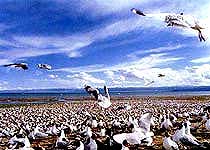 鳥島是青海湖最吸引游人的地方,島上棲息數以十萬計的候鳥而得名。其一面立于水中,另一面和湖濱陸地相連。島上植被稀疏,僅有零星小花點綴其間。其中海西山所形似駝峰,隨著湖水下降有所擴大,島頂高出湖面七點六米。島上鳥類數量多,約有八、九萬只之多。這里的斑頭雁、魚鷗、棕頸鷗的世襲領地。每年春天,斑頭雁、魚鷗、棕頸鷗等一起來到這里,在島上各占一方,筑巢壘窩,全島布滿鳥巢。到了產卵季節,島上的鳥蛋一窩連一窩,密密麻麻數也數不清,所以,人們又把這里也稱為蛋島,平時一般說的鳥島也主要是指這里。