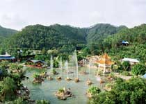 帝都溫泉以綠色植物覆蓋率和濃郁的山水文化氛圍聞名,整個旅游區占地200多平方米,其中溫泉浴區園林面積10多萬平方米,是目前世界上最大的園林式溫泉浴區。浴區內有不同水溫、不同形態的大、中、小露天溫泉浴池80多個,其中十二生肖浴池水面積3200平方米。溫泉日自噴水量達4100立方米,相當于3個標準游泳池的水量,水溫可高達73℃,熱水自噴可高出地表8~9米。