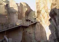 位于岱山島最西端的岱西鎮雙合村,此處原為懸水孤島,后經人工修造一條攔海大壩同岱山島相連。 兩座懸水小島,名南洞山、北洞山。由于地殼變遷,兩島合一為雙合山。峰挺拔雄偉,石壁刀削整齊,石幔五彩繽紛,在夕陽中,光怪陸離,景致極為壯觀,被譽為“石壁殘照”。 這里的石板,石質細而堅韌,經當地居民五六百年世世代代的艱辛取石開鑿,遣今有石景舊跡50多處,其中有幾處規模宏大,奇石怪洞形各有狀。有雄偉挺拔的石峰,形如刀削的石壁;有色彩繽紛的石幔,清晰見底的石潭,頗似紹興東湖的石景。