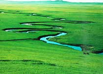 河床兩側河漫灘上生長著大量的蘆葦及其它水生植物,增加了河曲的美感。在河曲的下游,即為錫林河水庫,是垂釣愛好者的好去處。九曲河岸上有奇形怪狀的基巖出露,尤如先人留給我們的巨大觀景臺,登高遠望,河水清澈,綠草如茵,牛羊似珍珠般撒滿兩岸,這景色如詩如畫,好一派北國錦秀江山的巨幅畫卷。