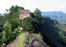 關卡雄奇,道路艱險逼仄是魚木寨的又一顯著特點。兩條下寨道路全以條石修就,石級陡窄,特別是亮梯子及三陽關手扒巖二段,堪稱天險。亮梯子始建于明,修建于寨東二迭絕壁之上,共28級,每級用長約1.5米,寬約40厘米的石板,一頭插入巖壁,一頭懸空建成,每兩級間互相亮開,故名。人行梯上,頭頂是緲緲藍天,腳下是萬丈深谷,既驚,又險,又奇!手扒巖筆直挖鑿于寨西北太平巖上,共32步,每步寬約50厘米,穴深不足20厘米,形如新月,為建路前古人上寨要徑。巖陡苔滑,斗膽攀登,魂系藍天,更增添了魚木寨風光的靈氣。