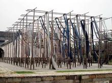 手工環保印染晾曬大型工坊。工坊占地2500平方米,曬布場地以青磚鋪就,豎立著密密麻麻的高桿和階梯式曬布架,規模相當龐大。