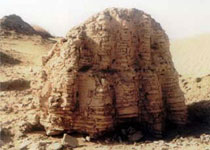 該遺址從建筑材料上看,殘存的墻壁和寺塔都是用曬干的土坯壘成的,有的還使用了燒過的磚。房屋則是用胡楊木構成,墻壁是蘆葦紡織的,纏得緊緊的一小捆一小捆蘆葦夾在棍子上,再在直豎的蘆葦把子上涂抹一層和著碎草的墻泥。墻內外兩面都刷了白灰,再繪制出優美的壁畫。城區曾出土有佛像、壁畫、陶器及古文字等,還有一些由成排的胡楊、杏樹、李樹等組成的花園。