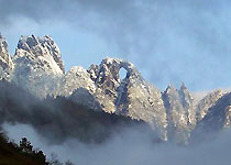 去石月亮,從福貢乘車,沿公路往北行駛多公里,在山區的利沙底下車后,沿高黎貢山一側的小路向上爬,大約走整整一天的路程后,下榻在石月亮下的小村寨米哦羅。于村中擇一塊平地,即可搭起帳篷,生火做飯。米哦羅是一個怒族村寨,極古老,縣里的文物隊在這里常常能征集到新石器時代的石斧等物。老百姓把石斧慎重的收藏著,放在米柜里,以圖吉祥。第二天一早,往峭壁上攀巖,不久,即可到達石月亮。石月亮四周是懸崖峭壁,深不可測,前面有三棵年代極其古老的枯樹,云霧升騰,飄飄渺渺,忽園忽缺,大有身在天上宮闕之感,凜冽的風吹來令人眩暈。若在此東望怒江大峽谷的江流云海及碧羅雪山日出,壯麗之極,不可言表。
