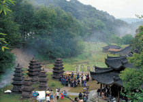 轉過牛家村,還有歸云莊八卦書屋(這里是被選為《天龍八部》的場景,拍攝少林和尚的生活戲。)、東邪黃藥師領地(有東邪八卦廳、八卦亭及塔林、黃蓉繡樓、財神閣、丐幫軒轅臺、在軒轅臺旁邊還有幾項自費的娛樂活動,如小李飛刀、彎弓射箭等。)、文君酒肆、楓林客棧、瑛姑院(瑛姑院的主屋是懸空,由木柱來支撐,那圓型的竹屋是瑛姑演奇門五行的場所,中間搭起了八卦型的臺,連接主屋與竹屋的走廊柱子,其形狀就像天上的北斗星)等景點。