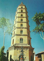 距平羅縣城20公里的田州塔,俗稱姚伏塔,矗立在姚伏鎮東一公里外的柳蔭叢中。塔呈平面六角形,八層樓閣式磚塔,高38米,塔頂呈六邊覆斗狀,塔底直徑為7.5米,南北各有一門,門墻上有對聯,對聯書法雋秀有力,對仗工整。