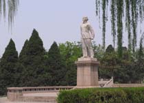 大廳后是陵墓,烈士的忠骨就埋在正面的高臺上。臺上是蒼松翠柏,墓上綠草茵茵。墓前聳立著8米高漢白玉雕像,栩栩如生地再現了劉胡蘭當年的英雄風采,令人肅然起敬。