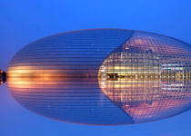 国家大剧院中心建筑为独特的壳体造型。壳体表面由18398块钛金属板和1226多块超白玻璃巧妙拼接,营造出舞台帷幕徐徐拉开的视觉效果。壳体周围是面积达3.55万平方米的人工湖及由大片绿植组成的文化休闲广场,不仅美化了大剧院外部景观,也体现了人与自然和谐共融的理念。