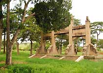 在苍松翠柏中,一字排开两座陵园,东为历代扎萨克之陵寝,西为历代扎萨克亲族之墓区。东陵园南北长130米,东西宽127米,前正门为明堂,明堂两侧各有一侧门。穿过明堂,在松柏掩映下是一座三进式石拱牌坊,正中镌刻康熙御笔“藩屏世泽”四个大字,四个石柱上各立有一只石刻望天吼,经历了三百多年的风风雨雨,似乎仍在仰天长啸。过了牌坊是五间佛殿,佛殿后是三间享殿,内供奉喀喇沁先王的灵位。陵寝在享殿后较高处。正中为第一代喀喇沁右翼旗世袭扎萨克多罗杜楞贝勒固鲁思奇布的陵墓。陵墓形制为砖砌宝顶。以下各代呈人字形左右排开,共有坟头十三座,分别建有祭亭。西陵园是喀喇沁祖陵和镇国公敏珠尔拉布坦、镇国公罗卜藏车布登及后人的陵园。由于历史原因,西园早已荡然无存。