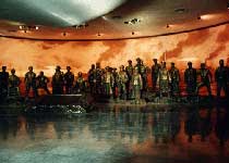 馆内以电、光、声等现代科技营造的氛围,生动逼真,游人置身其中,耳闻目瞩甲午战争的惨烈与悲壮。整个海战馆气势宏大,外型有如几艘互相撞击穿插的船体,坐落在当年旗舰定远号搁浅的地方,悬浮于海上。18米高的主体建筑上塑造了一尊15米高的北洋海军将领像,为国内人物雕塑之最。