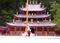 扎如寺坐落在九寨沟的扎如沟中,沿扎如马道前行至苹果园即到。它背依一脉苍山,面临宝镜崖,金顶红檐,掩映于果林,五色经幡切切祈祷于风中。既有肃穆的禅味,又有原始土著宗教的遗风。