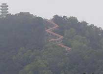 在鳌峰山南边有一条尤廊,从远处眺望,象一条黄龙从山顶顺势而下,片片黄色的琉璃屁活象龙的鳞甲。龙尾在山顶翘起,那是六层高的追月楼,楼中陈列广东省著名的书法家留下的墨迹。龙头是一座两层高的亭子,名叫龙亭,游客可在此品尝各种美点。整条龙廊长360米,宽2米,九曲七十七卡相连,廊内檐上绘有《西游记》、《水浒传》、《三国演义》、《红楼梦》四大古典皂著工笔画308幅。龙头的前方,建有日晷仪一座,可以凭日照来看时辰。日晷仪是圆形的,远远看上去象是黄龙戏珠,气势磅磁,仪态万千。