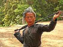岜沙最有特色的是男子留发髻和古代部落武士形象:岜沙男子剃光头,只有头顶处留头发,而且都挽着一个模式的发髻,同时随身必佩火枪、腰刀,身着自织自染自制的无领右开衽铜扣青布衣,直筒青布裤,裤管很大,看上去让人想起远古时代的武士。