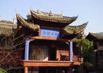 戏台背靠大门牌楼,与正殿相对,离地2.1米。台上正中题曰“观古鉴今”,台前两侧悬挂对联一幅:“数尺地方可家可国可天下;千秋人物有贤有愚有神仙”。玄妙而又真切。台后正中彩绘福禄寿三星画,上面藻彩绘戏剧人物九幅,均是一幅一典。台顶为重檐青瓦屋面,飞檐翘角,古范例雅端庄。