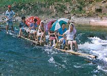 早雾山下端河道突转急弯,形成“刁潭”,岸边巨石上的“潭古印”,形象地记录了昔日放筏工艰难的岁月。这里不知有多少放筏工误落水中,而落水者却浮而不沉,因而留下了“刁潭不刁”的神奇传说。而“胡老湾冲浪”则更是一弯三折,滩中有垅、垅中有滩,千余米的河道落花流水差一米多,游人最能体现“两岸猿声啼不住,轻舟已过万重山”的古诗意境。急滩甫过,溪西山便到了,这里山高水秀,常有云雾缭绕,村舍依山俯傍水而筑,是道地的农家风光。沿流停筏,小扣柴扉,你能喝到顶级的绿茶“溪西山毛峰”。接下来便到了五雀岭景区,这里有鸡公石、马影石、木鱼墩、百亩草坪、高滩晚钓、断桥绿水等景点,人称“江南小漓江”。