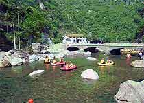 在这里可以感受到划着要橡皮艇,穿梭急流,飘在空中,坐在竹梢的神奇魅力,所以这里也有号称“天上第一漂”的美誉。若有兴趣,可以在漂流终点露天的游泳场游泳,可以在溪里抓石斑鱼,可以躺在橡皮艇上晒太阳,可以感受着夏威夷悠哉悠哉的感觉。可以穿一线天峡谷,看百米大瀑布,还可以在这里看农家磨豆腐,酿荞麦酒,吃烧烤,品尝报福本鸡,天赋的鱼头等。