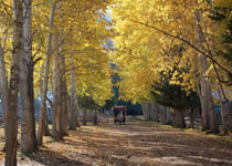 位于白哈巴村后方,道路两旁是高大的白桦,金色的树叶搭成了一个长长的拱廊,阳光穿透树梢映下来,遍地的落叶闪着金光,非常漂亮。在这里流传着一个顺口溜:“喀纳斯的牛羊,走的是黄金道、吃的是中草药、喝得是矿泉水、拉的是六位地黄丸、撒的是太太口服液”。