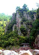 剑门关是浙西大峡谷中的主要景点,五尊并峙的岩峰称为“五世同堂峰”,高高低低,排列有序,横挡昌北溪流形成“关门”。中有宝剑石一对,恰似宝剑剑刃,刺向蓝天。“剑门”因此两峰而得名。