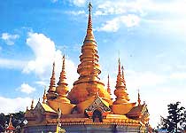 孟连大金塔位于普洱市孟连县的南垒河畔,由8个小塔环抱一个主塔构成,主塔高31.68米,每座塔均挂有风铃,每当风吹过,风铃便发出轻脆的叮当声,让人感受到别样的的佛国意韵。