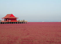 Panjin Red Beach Scenic Area as a whole is located in Panjin reed sea 120 million acres of wetlands. Where wetlands are the most southern limit of breeding red-crowned crane is the world';s rare birds, the main breeding Gull. Habitat of the vast sea of hundreds of reed hundreds of thousands of birds. With the wonders of nature here - Red Beach, the beach is woven on the red salsa Yi Keke Cellusoft the grass. The annual grassApril grow above ground, and early Nenhong, gradually turn deep, in September from red to purple, grow in salt brine stains, the year after year, rendering the red sea.