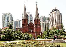 Xujiahui Catholic Cathedral is famous for Cathedral Catholic diocese of Shanghai, the formal name "Our Lady Mother of the Church of God." Was built 22 years before dynasty (AD 1896), the French medieval style. On both sides of the lobby at the top of the clock tower and Gothic spire is 50 meters high. Mary holds baby Jesus in the lobby like made in 1919 after arriving from Paris to Shanghai. The church has been listed as cultural relics in Shanghai.